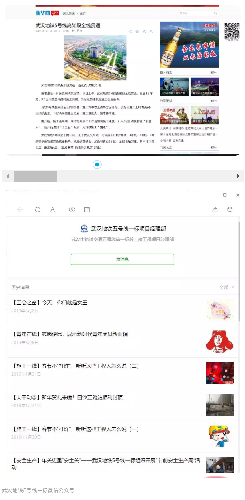 武漢地鐵5號線一標項目黨支部成立了由項目書記為組長的宣傳工作領導小組,組織制定了項目宣傳工作年度計劃及獎懲辦法。在《中鐵上海工程》報投稿工作方面,每月制定宣傳工作總結和下月工作計劃,截至目前已在《中鐵上海工程》報上刊稿6篇。在對外宣傳工作方面,在重大節點、人才培養、企業文化等方面深入挖掘,此外,黨支部還創辦了“武漢地鐵五號線一標項目經理部”微信公眾訂閱號,每日上傳施工日報,并結合施工生產、黨建工作及企業文化等方面情況,開辟了大干動態、黨群園地、信息速遞等欄目,第一時間推送微信信息,將微信公眾號打造成了展示項目文化的“窗口”。